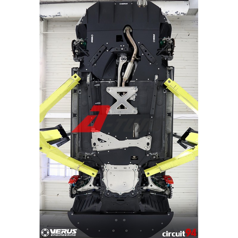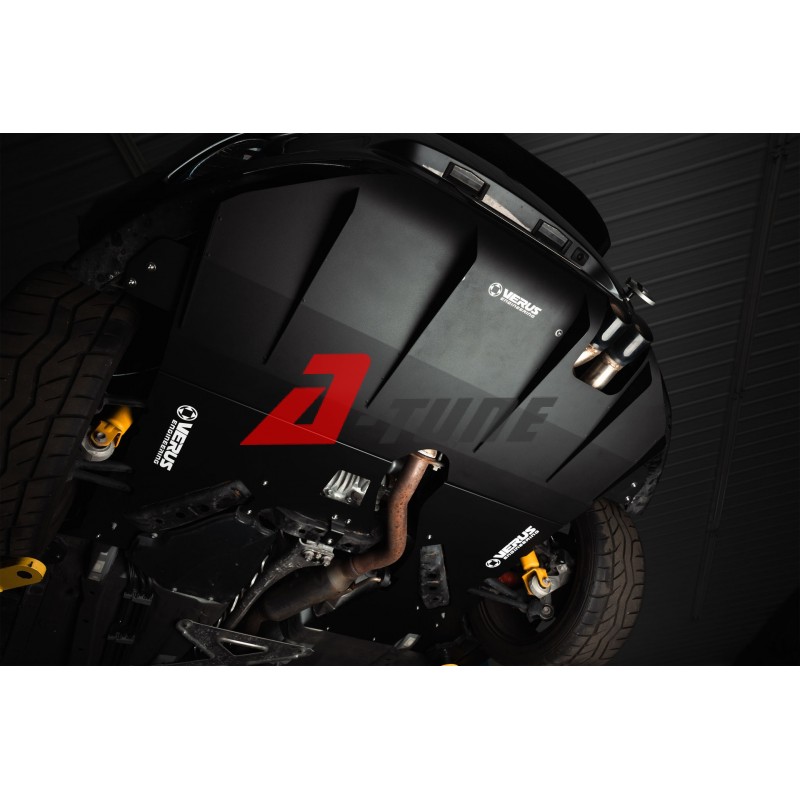 Дефлектори виготовлені з вуглецевого волокна 2x2 twill і кріпляться до автомобіля за допомогою скотчу 3M. Кришки задньої підвіски, плоскі панелі днища та задній дифузор оптимізовані за допомогою CFD та виготовлені з алюмінієвого листа 5052, лазерно вирізані та зігнуті на пресі для посадки та обробки рівня OEM-Plus.